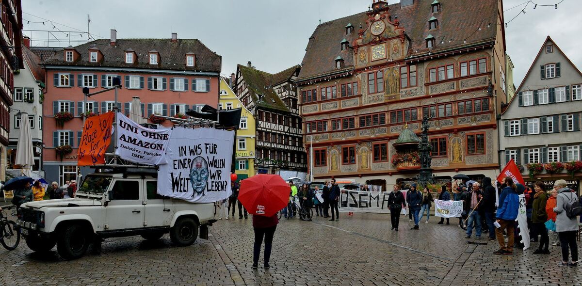TÜBINGEN. Mit Bannern mit Aufschriften wie »No Place for War & KI«, »No Amazon« oder »No Cyber Valley« haben Donnerstagnachmittag rund 50 Personen gegen die Ansiedlung des US-Konzerns Amazon in der Tübinger Cyber Valley demonstriert. Die Demo, die gegen 15 Uhr an der Karlstraße startete, endete gegen 16.15 Uhr auf dem Marktplatz mit einer Kundgebung.