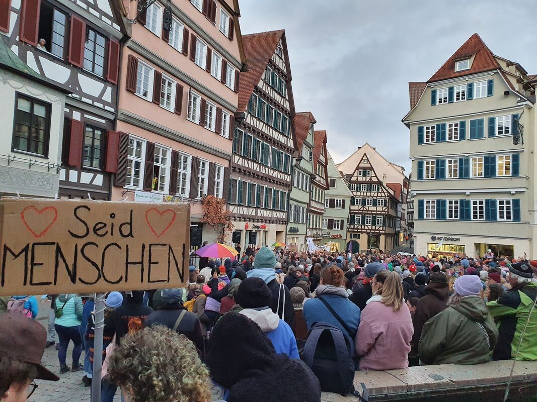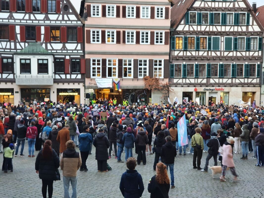 Die Kundgebung auf dem Tübinger Marktplatz wurde unter dem Motto »Wir sind das Stadtbild. Lichtermeer für Vielfalt und Menschenwürde« abgehalten. Rund eine Stunde zuvor hielt Die Linke auf dem Holzmarkt vor der Stiftskirche gemeinsam mit der Gewerkschaft Verdi, Attac, der Arbeiterwohlfahrt, dem Arbeitslosentreff TAT und weiteren Organisationen eine Kundgebung »Stoppt die Aushöhlung des Sozialstaats« ab. Hier kamen rund 100 Menschen zusammen. (GEA)