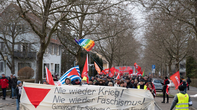 Die Breite Straße hinauf zog der Marsch zunächst bis zum Jakob-Stotz-Platz, wo der Nehrener Journalist Jürgen Jonas einige der damaligen Anführer porträtierte, auch jenen Glasermeister Jakob Stotz. Er war vor 1933 und nach dem Krieg Gemeinderat in Mössingen gewesen. An seine Rolle beim Generalstreik erinnert erst nach langen Protesten eine Metalltafel. Einige Jugendliche aus Tübingen trugen ein Transparent. »Stoppt den Krieg« war da zu lesen, wobei sie keinen konkreten meinten. »Mehr so allgemein« sei die Aussage zu verstehen, erläuterte einer.