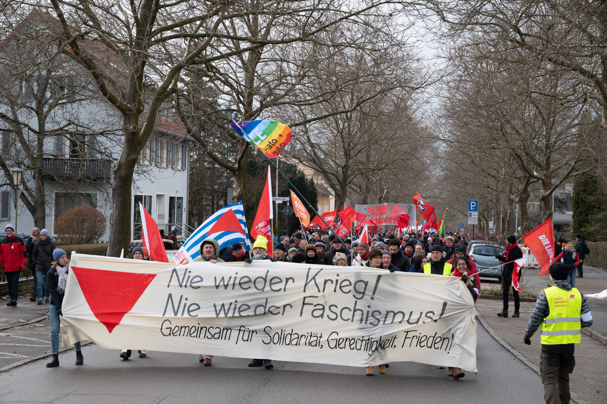 Gerade hatte Claudia Jochen den jungen Leuten unter den Teilnehmern für ihren Einsatz gedankt, da verließen viele von ihnen den Platz vor der Turnhalle. Kai Burmeister, der DGB-Landesvorsitzende in Baden-Württemberg, hob den heutigen Kampf der Gewerkschaften gegen den alltäglichen Faschismus hervor. Wegen ihm waren die jungen Aktivistinnen und Aktivisten offenbar nicht gekommen. Sie verpassten aber auch die Rede von Dr. Wolfgang Däubler. Er kritisierte mit deutlichen Worten die Haltung der Bundesregierung im Ukrainekrieg. Ob man sich denn Sanktionen gegen die USA »wegen ihres Angriffskrieges gegen Afghanistan« hätte vorstellen können fragte er provokant. »Heute liefert Deutschland Leopard-Kampfpanzer, aber Selenskyj will mehr: Kampfjets und Raketen«, rief er den verbliebenen Teilnehmern zu. »Und die Grünen?« fragte er. Aus der früheren Friedenspartei sei eine geworden, an der die Rüstungsindustrie ihre helle Freude hat, spottete Däubler. »Allen voran der Friedenskämpfer Anton Hofreiter!« Sein Ausruf wurde mit vielstimmigen Pfui- und Buhrufen aufgenommen.