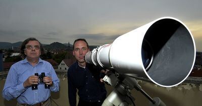 Es muss nicht gleich ein großes Fernrohr sein. Frank-Martin Rapp (rechts) und Heinz Lenhart auf dem Dach der Steinbeis-Schule in Reutlingen.