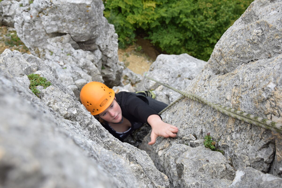 Fast am Ziel: Paula, die nicht zum ersten Mal beim Ferienprogramm dabei ist, steigt gleich mit der 20 Meter Route am Wiesfels ein. FOTO: SPAHLINGER