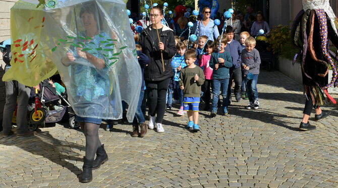 KIRCHENTELLINSFURT. Mit einer Parade durch die Straßen ist das erste Figurenfestival in Kirchentellinsfurt gestartet. Über 100 Kinder der örtlichen Kindergärten begleiteten am Freitagnachmittag den Neckarkönig und sein Gefolge beim offiziellen Eröffnungsumzug, der das dreitägige Theaterspektakel einläutete. Vor dem Rathaus wurde die Prozession von den beiden Maskottchen empfangen – dem Bären Brummelbutz und der waschechten Schwäbin Berta.