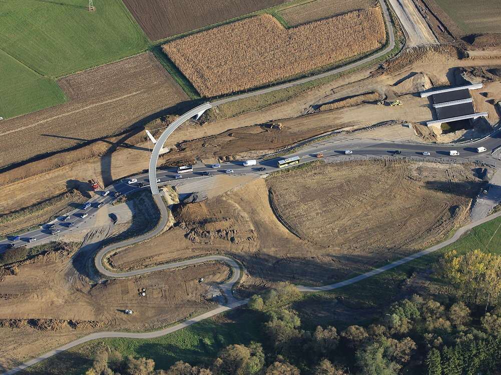 B 27-Baustelle bei Nehren: Von Dußlingen nach Ofterdingen (von links nach rechts) führt ein Provisorium in Schlangenlinien, die Zufahrt von Nehren (oben) ist gesperrt.