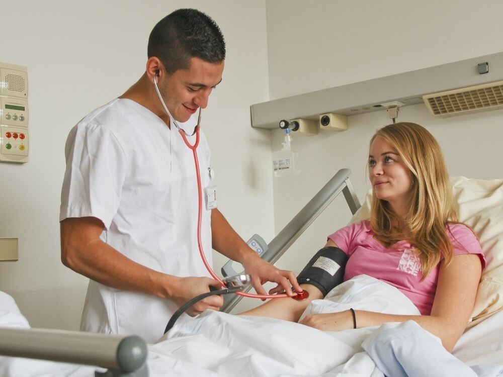 Enrico Pennino bei der Arbeit auf der Station. Als »Patientin« hat sich eine Mitarbeiterin fürs Foto zur Verfügung gestellt. FOTO: SCHRAMM