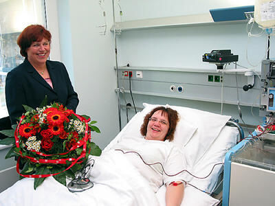 Glückwunsch von Adelheid Heilemann für Rebekka Lachmann, die die 6 000. Stammzell-Spenderin ist.