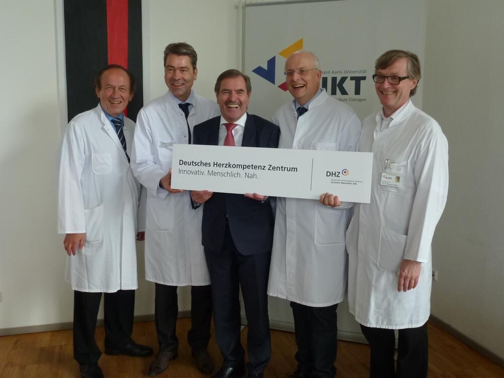 Die Professoren (von links) Reinhard Kandolf (Molekulare Pathologie), Christian Schlensak (Thorax-, Herz- und Gefäßchirurgie), Klinik-Chef Michael Bamberg, Meinrad Gawaz (Kardiologie und Kreislauferkrankungen) und Michael Hofbeck (Kinder- und Jugendmedizin) freuen sich über die Gründung des Deutschen Herzzentrums an der Uniklinik.