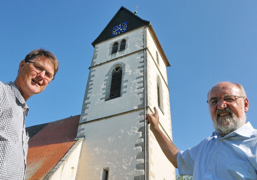 Sanierung Dußlinger Kirche: Albert Hörz, Architekt von Riehle und Assoziierte, und Peter Klett, stellvertretender Kirchengemeinderatsvorsitzender in Dußlingen unterhalb des renovierten Ziffernblatts der Peterskirche. GEA-FOTO: MEYER