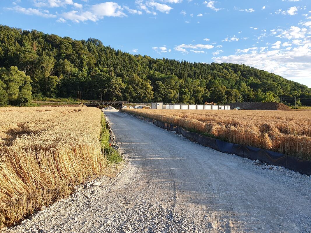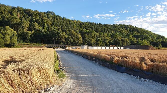 Nicht zu übersehen im Neckartal: Die Baustelle bei der Brücke wird eingerichtet