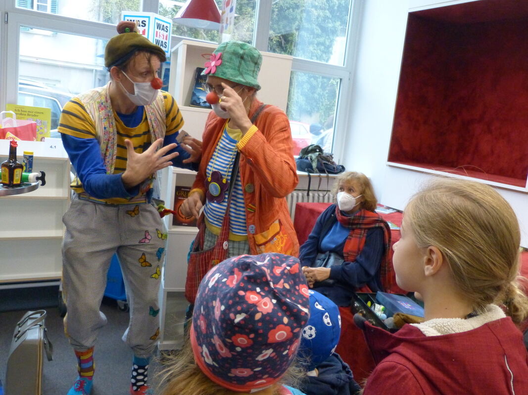 TÜBINGEN. Kinder wuseln, Luftballons platzen, Knollennasen wackeln: Die Clowns im Dienst Tübingen trieben ihren Schabernack in einer etwas weniger sterilen Umgebung als gewohnt. Am Samstag besuchten sie die Stadtbibliothek und demonstrierten, wie man mit Würzsoßenfläschchen Knirpse zum Kichern bringen kann. Hintergrund war ein bundesweiter Aktionstag des Dachverbands Clowns in Medizin und Pflege zum Motto »Bühne frei – für ein Lächeln«. »Heute wollen wir zeigen, dass es uns gibt«, sagt die Gründerin des Tübinger Vereins, Christel Ruckgaber. Denn normalerweise bekommt nur ein begrenzter Personenkreis mit, was die Clowns leisten – nämlich Menschen, denen es nicht so gut geht. Rund 1.000 Besuche in Kinderkliniken, Demenzstationen und Pflegeheimen machen die Clowns im Dienst in Jahren ohne Corona-Beschränkungen. 18 speziell ausgebildete Clowns sind in Teams unterwegs, um kleine und größere Patienten von Schmerzen und Angst und Klinikalltag abzulenken. Seit 22 Jahren gibt es den Verein, mittlerweile reicht das Einsatzgebiet von Schwäbisch Gmünd über Reutlingen bis Rottenburg. Das junge Publikum in der Bücherei musste allerdings schon ein wenig mitarbeiten – und etwa Quizfragen beantworten. Bunte Murmeln und Puscheln gab es zur Belohnung. (kal)