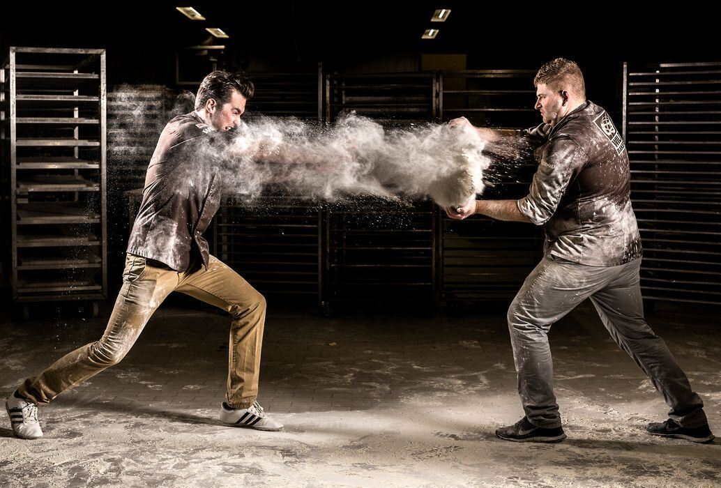 Der Gomaringer Jörg Schmid (links) und sein Kumpel Johannes Hirth aus Bad Friedrichshall wollen als »Wildbakers« das Bäckerhandwerk von seinem verstaubten Image befreien. Wenn es sein muss, mit ganz viel Mehl. Beide wurden 2012 als beste deutsche Bäcker ausgezeichnet und sind Mitglied der deutschen Nationalmannschaft der Bäcker. FOTO: DANIEL SCHNEIDER