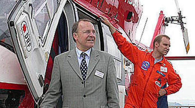 Dr. Michael Schulze mit Thomas Kirchner, einem Piloten der Rettungsflugwacht bei der Demonstration der Zusammenarbeit der Rettungsdienste.