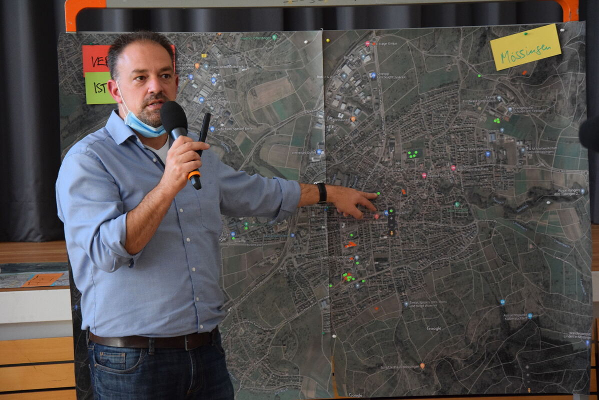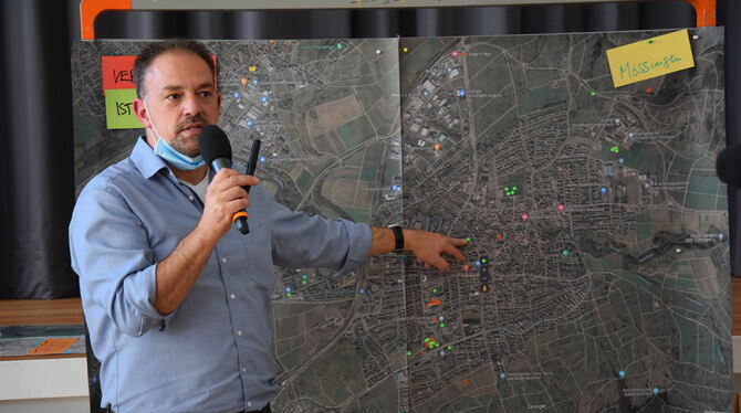Stadtplaner Timo Buff moderierte das Jugendhearing in Mössingen. Mit den grünen Punkten markierten Jugendliche Plätze, die sie gerne aufsuchen. Rot steht für Orte, die verbessert werden sollten. FOTO: WALDERICH