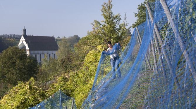 Zu Beginn der Weinlese hängt Bärbel Repnik die Netze an der Rottenburger Ehalde ab. Im Hintergrund die Weggentalkirche. FOTO: JOHANNES SCHMID