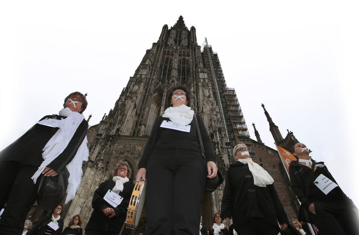 Als Flashmob demonstrierten rund 100 Frauen und Männer in Ulm mit Pflastern auf Mündern für Gleichberechtigung, gegen die Machtstrukturen in der katholischen Kirche.