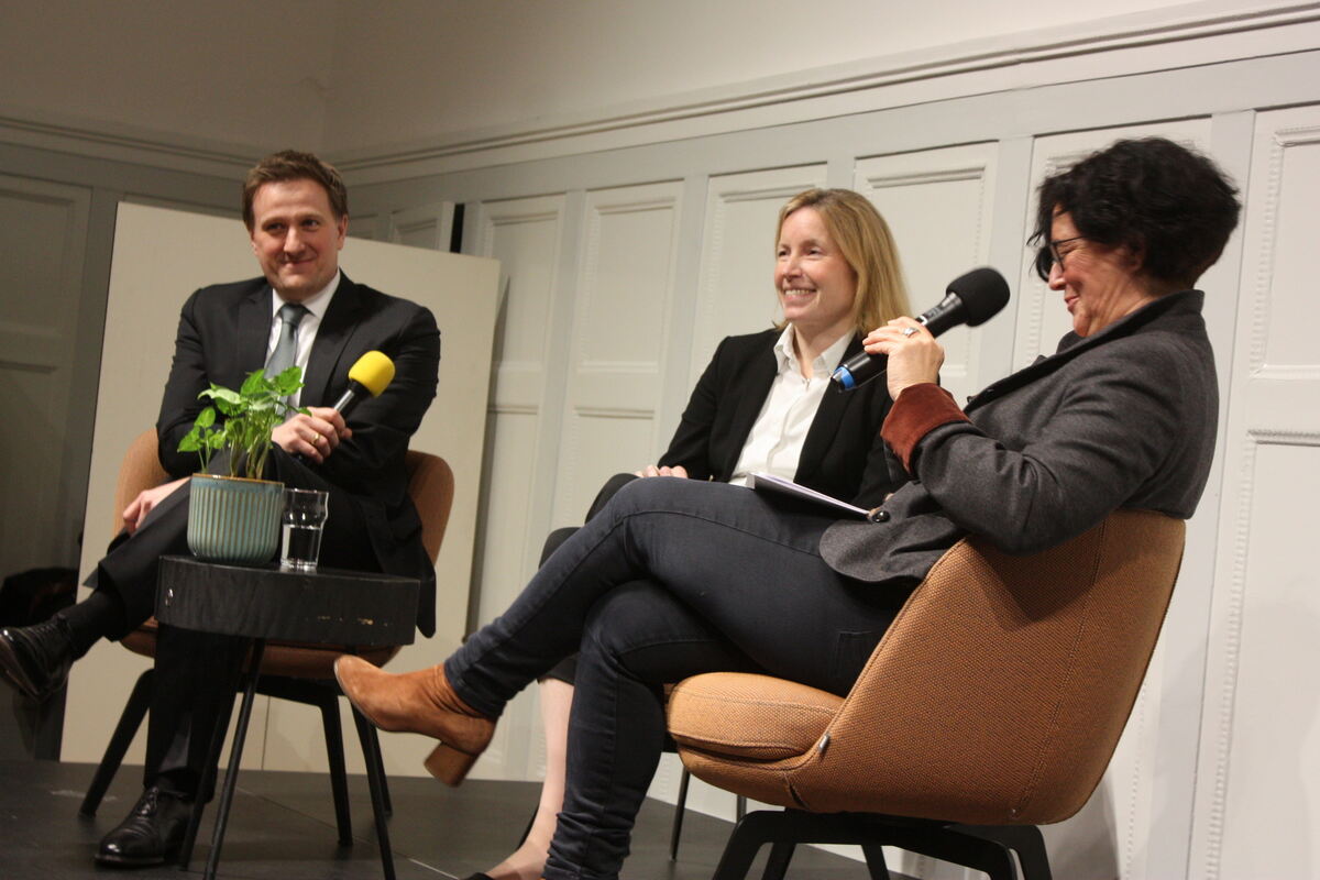 Sie gehören zu den vernetzten Spezialisten am ZSE Tübingen (von links): Hendrik Rosewich (Ärztlicher Direktor Neuropädiatrie) und Anke Tropitzsch (Leiterin des Hörzentrums an der HNO-Klinik) im Gespräch mit Moderatorin Ulrike Ostner.
