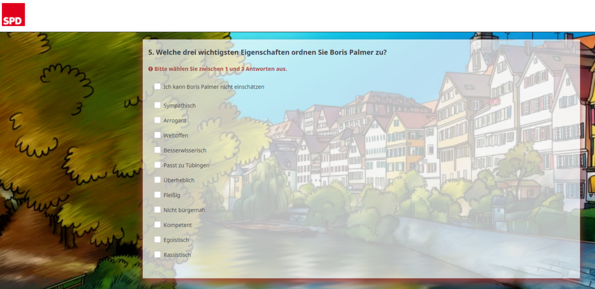 Bei der SPD-Umfrage können Teilnehmerinnen und Teilnehmer Boris Palmer auch persönliche Atribute zuordnen, wie beispielsweise besserwisserisch oder arrogant.