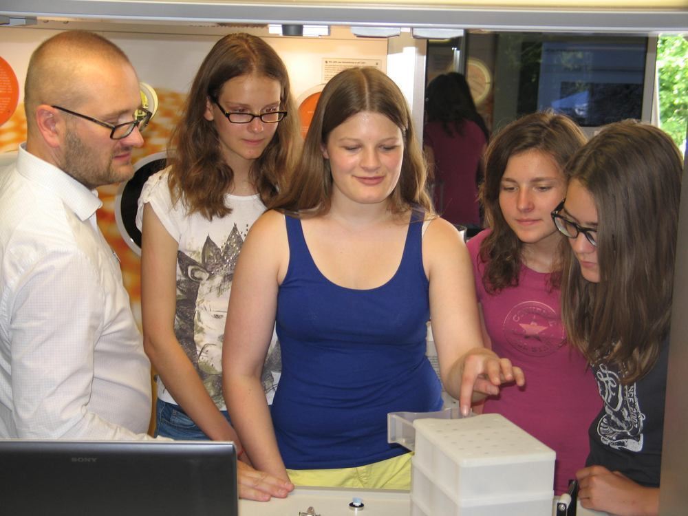 Mit dem Raster-Elektronen-Mikroskop selber Bilder erstellen war eine der Aufgaben für die Neuntklässler vom Höhnisch. Alexander Heusel (links) erläuterte, welche Materialien besonders gut zur Geltung kommen.
