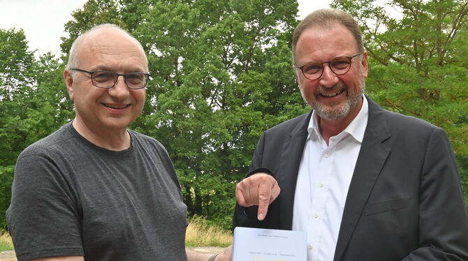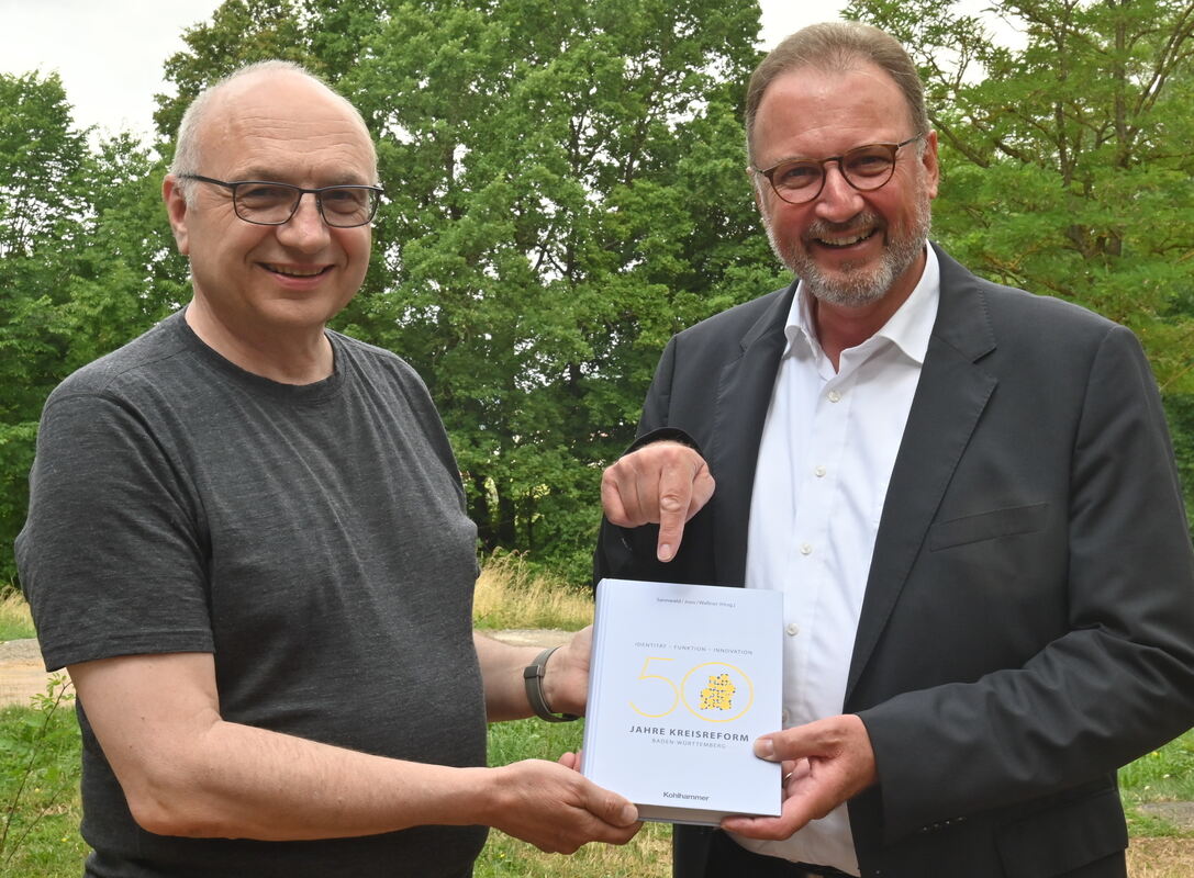 Erinnerungen an den großen Wurf: Vor fünfzig Jahren erhielt Baden-Württemberg seinen heutigen Gebietszuschnitt. Mitherausgeber Wolfgang Sannwald (links) und Landkreistagspräsident Joachim Walter mit dem Buch zum Jubiläum. FOTO: MEYER