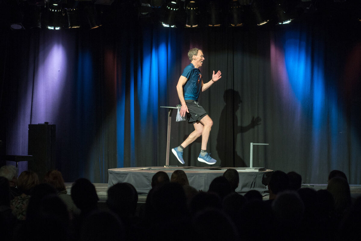 Auf der Bühne steht er dabei allerdings nicht mehr. Sondern Baumann läuft darauf, was sollte er auch sonst? Sein aktuelles Programm absolviert er eine Stunde und 25 Minuten lang auf einem in die Bühne eingelassenen Laufband. Teils tanzt er auch darauf.