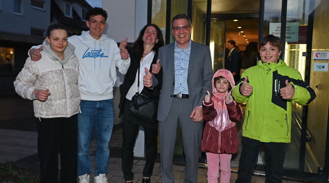 Geschafft: Der neue OB Dirk Abel mit Frau Iris und ihren vier Kindern nach der Stimmen-Auszählung vor dem Balinger Rathaus. FOTO: MEYER