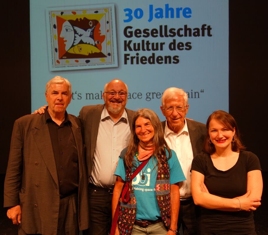 Solidarisch im Kampf für den Frieden (von links): Moderator Henning Zierock mit seinen Gästen auf dem Podium Jürgen Grässlin, Heike Kammer, Franz Alt und Jacqueline Andres. FOTO: STRAUB