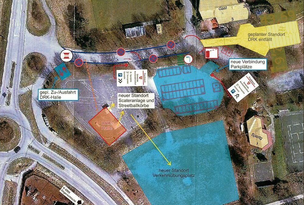 So könnte es gehen: Rechts gelb markiert der bisher vom Rathaus favorisierte Standort. Links und weiter unten, dazu rot umrandet, die nun vorgestellte Variante. Der Verkehrsübungsplatz würde auf den Festplatz verlegt werden. ENTWURF: BS-INGENIEURE