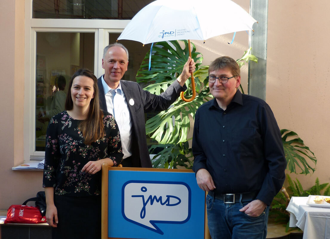 JMD-Mitarbeiterin Elena Gerhard, Walter Weissgärber, Leiter der Bereiche Migration und Integration der Bundesgemeinschaft evangelischer Jugendsozialarbeit und JMD-Mitarbeiter Uwe Gieseler. FOTO: KLAUS FORSCHNER