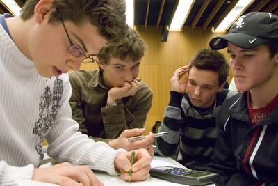 Konzentriert bei der Sache: Benedikt Walter, Benedikt Müller, Robin Loose und Michael Stapf (von links), Schüler des Quenstedt-Gymnasiums Mössingen, beim Mathe-Wettbewerb.