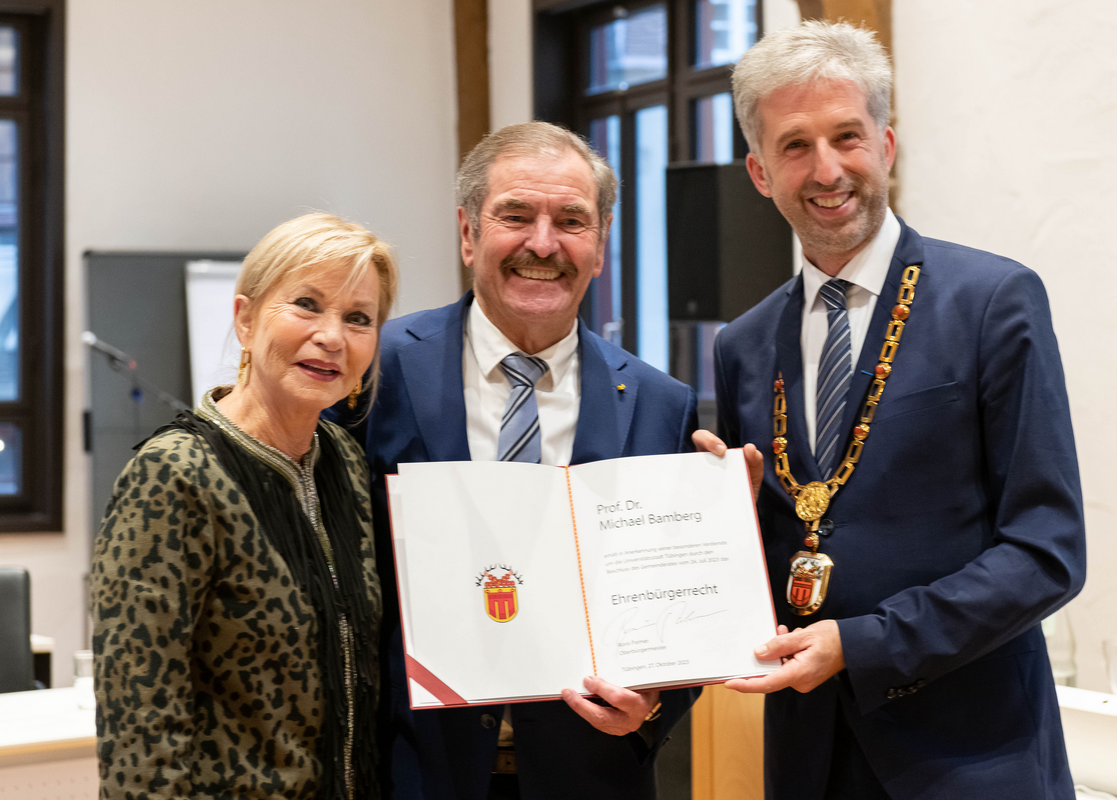 Michael Bamberg (Mitte) und seine Frau Regina freuen sich gemeinsam mit Oberbürgermeister Boris Palmer.