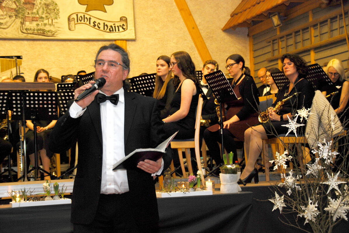 Kritische Worte zum »Graf-Zeppelin-Marsch« erlaubte sich Moderator Pfarrer Jörg Conrad. Nicht nur ihm kamen dabei Bilder von marschierenden Soldaten in den Sinn. FOTO: EBER
