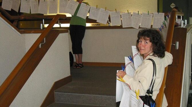 Räte bei der Ankunft empfangen: Eltern machen sich im Mössinger Rathaus vor der Gemeinderatssitzung für den Erhalt der Belsener Oberdorfschule stark und hängen über 1 000 Unterschriften an eine Wäscheleine, die sie hoch in Richtung Bürgersaal spannen.