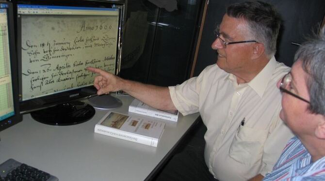 Günther Schweizer wirft einen Blick auf die von den Gomaringern abfotografierten Kirchenbücher.
