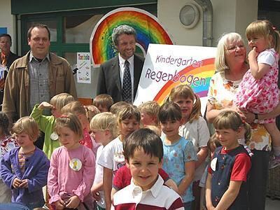 Unter dem Regenbogen vereint: Zusammen mit den Kindern freuten sich (von links) Christoph Heine, Bernhard Knauss und Marianne Dotzenroth über die sonnige Einweihung des neuen Kirchentellinsfurter Kindergartens mitten im Ort in der Kirchfeldstraße.
