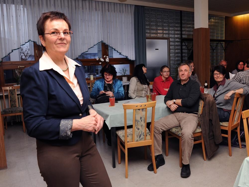 Die Rechtsanwältin und grüne Gomaringer Gemeinderätin Petra Rupp-Wiese präsentiert sich im Nebenzimmer des Gasthauses Bahnhof das erste Mal öffentlich als Bürgermeister-Kandidatin und kommt mit den Gästen über Ortsthemen ins Gespräch.