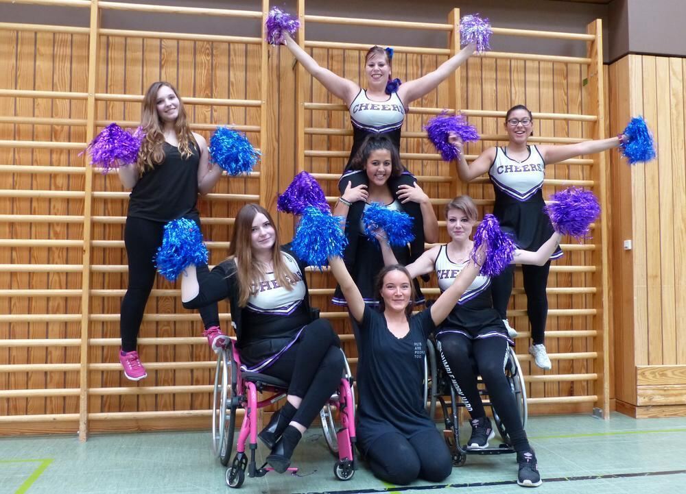 Pyramidentraining an der Sprossenwand: Gruppengründerin Asun Kramer (Mitte oben, auf der Schulter sitzend) und ihre Mittänzerinnen der Inklusions-Cheerleadergruppe »Blue Poisons«. FOTO: WEBER