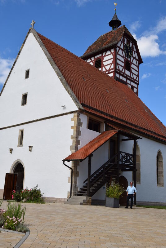Pfarrer Jörg Conrad steht vor der Veitksirche. Der älteste Teil mit dem Turm soll aus dem 15. Jahrhundert stammen.