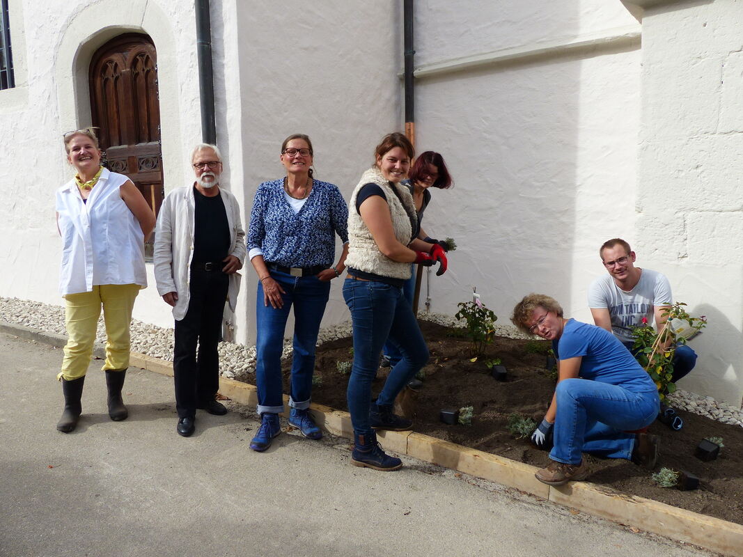 Zahlreiche freiwillige Helfer beteiligten sich an der Pflanzaktion mit Lavendel, Rosen und Storchschnabel vor der sanierten Außenfassade der Jakobuskirche. FOTO: WEBER