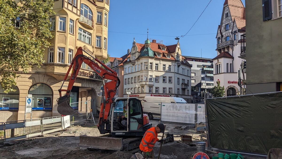 Wer derzeit vom Univiertel kommt, aus der Mühlstraße oder herunter vom Österberg, muss an einer Baustelle vorbei. Die Gäste des Schwarzen Schafs und der Wurstküche blicken direkt auf Bagger, Bauzaun, Absperrgitter und Grube. Doch in sechs Wochen soll die Ecke ganz freundlich aussehen.