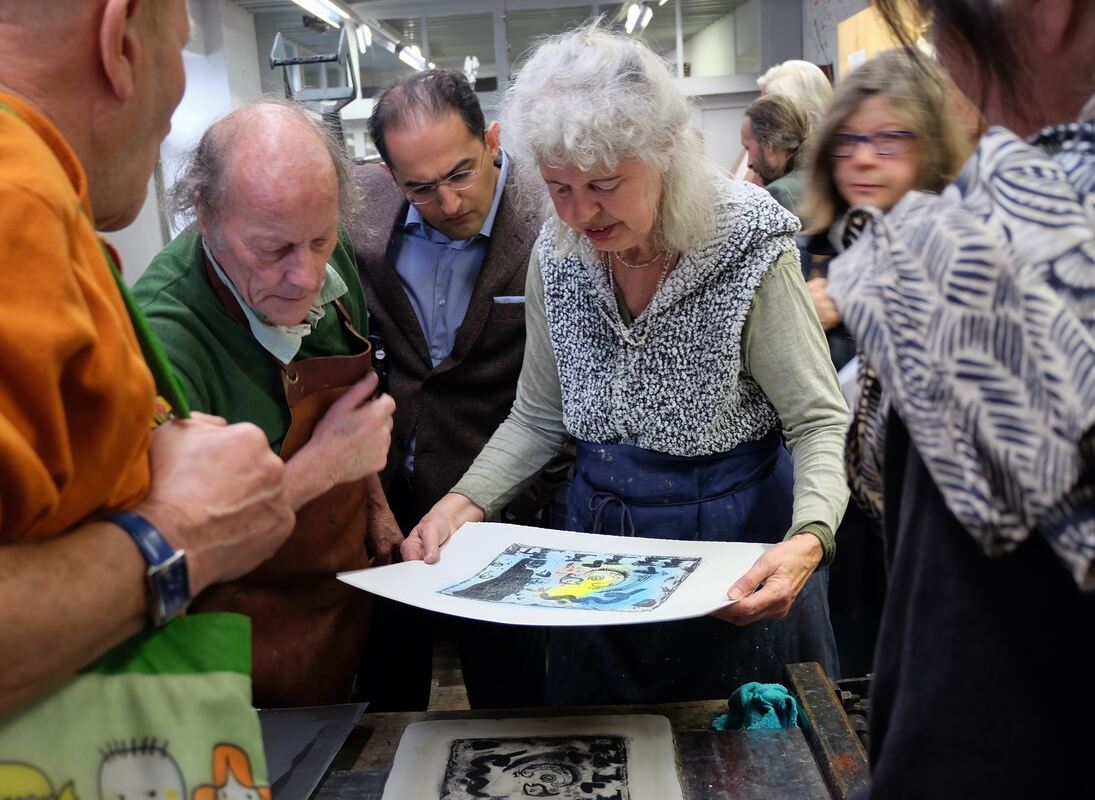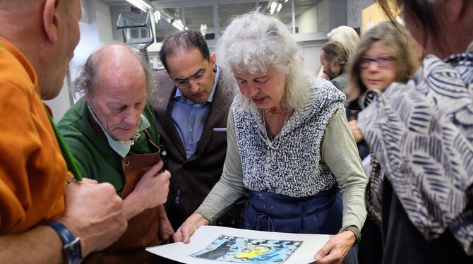 Die Künstler Dieter Lutz und Natascha Mann führen vor, wie das Drucken an den alten Pressen funktioniert.