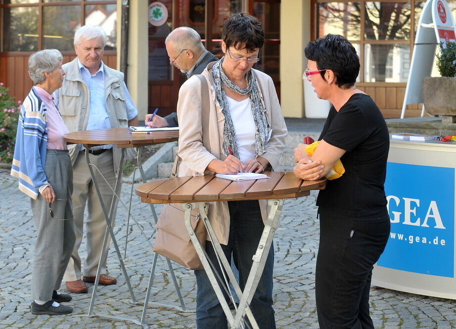 »Was sagen Sie zu den Plänen für ein Prüfzentrum mit Teststrecke auf dem Einsiedel?«, wollte die GEA-Redaktion beim Lokaltermin auf dem Kirchentellinsfurter Rathausplatz wissen. Vorne spricht Petra Kühne (rechts) mit GEA-Redakteurin Brigitte Gisel. Dahinter notiert ihr Kollege Joachim Kreibich die Meinung von Ulrike und Alois Schober.