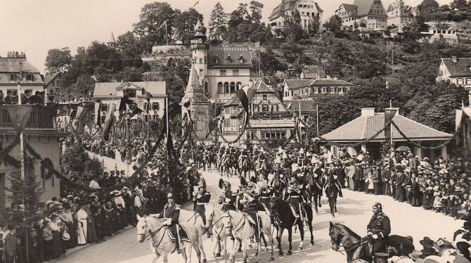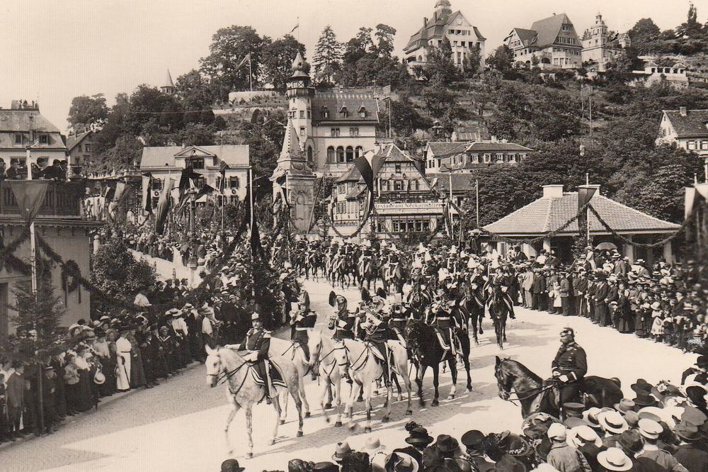 Alles schwarz-weiß: Die Postkarte von 1913 zeigt den Festzug zum Liederfest des Schwäbischen Sängerbundes. FOTO: VERKEHRSVEREIN