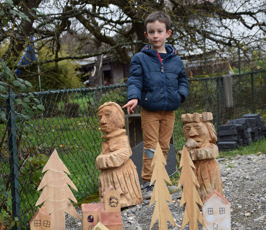 Mit der Motorsäge gestaltete Figuren: Die Krippe der Familie Nerz im Hofstattweg. Der sechsjährige Amon kennt sich aus.