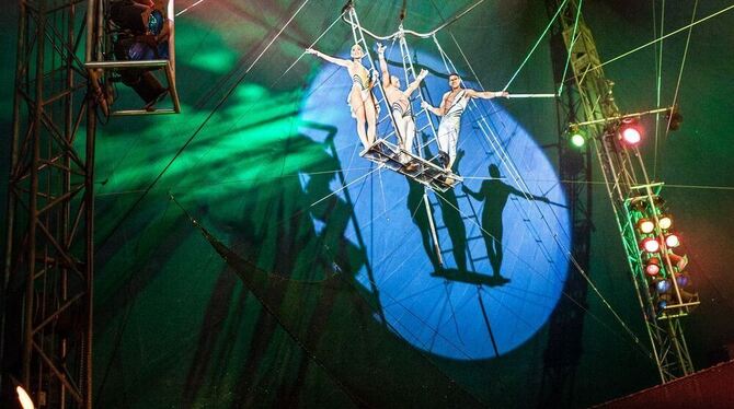 Zum spektakulären Zirkusprogramm im Zelt von Charles Knie gehören auch die »Flying Costa« mit dem dreifachen Salto Mortale im Repertoire – die Freiheit der fünf brasilianischen »Lufthasardeure« liegt wohl hoch über dem Erdboden.