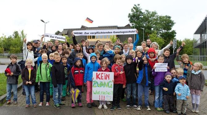 Schule soll nicht Lebensmittelpunkt der Kinder werden, forderten 30 Eltern und ihre Kinder vor der Maria-Sibylla-Merian-Realschule.