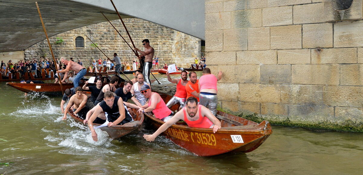 TÜBINGEN. Nach zwei Jahren coronabedingter Pause geht es am Donnerstag, 16. Juni, auf dem Neckar wieder turbulent zu. Einmal im Jahr verwandelt sich die beschauliche Szene der gemächlich dahingleitenden Stocherkähne auf dem Fluss in ihr krasses Gegenteil. An Fronleichnam gegen 14 Uhr wird es plötzlich für eine gute Stunde eng auf dem Wasser. Über vierzig Kähne mit je acht Personen besetzt drängeln sich dann dicht an dicht, um auf den Startschuss zu warten und dann mit den Händen loszupaddeln. Das Stocherkahnrennen beginnt und damit eines der lustigsten und wildesten Spektakel im Tübinger Veranstaltungskalender.