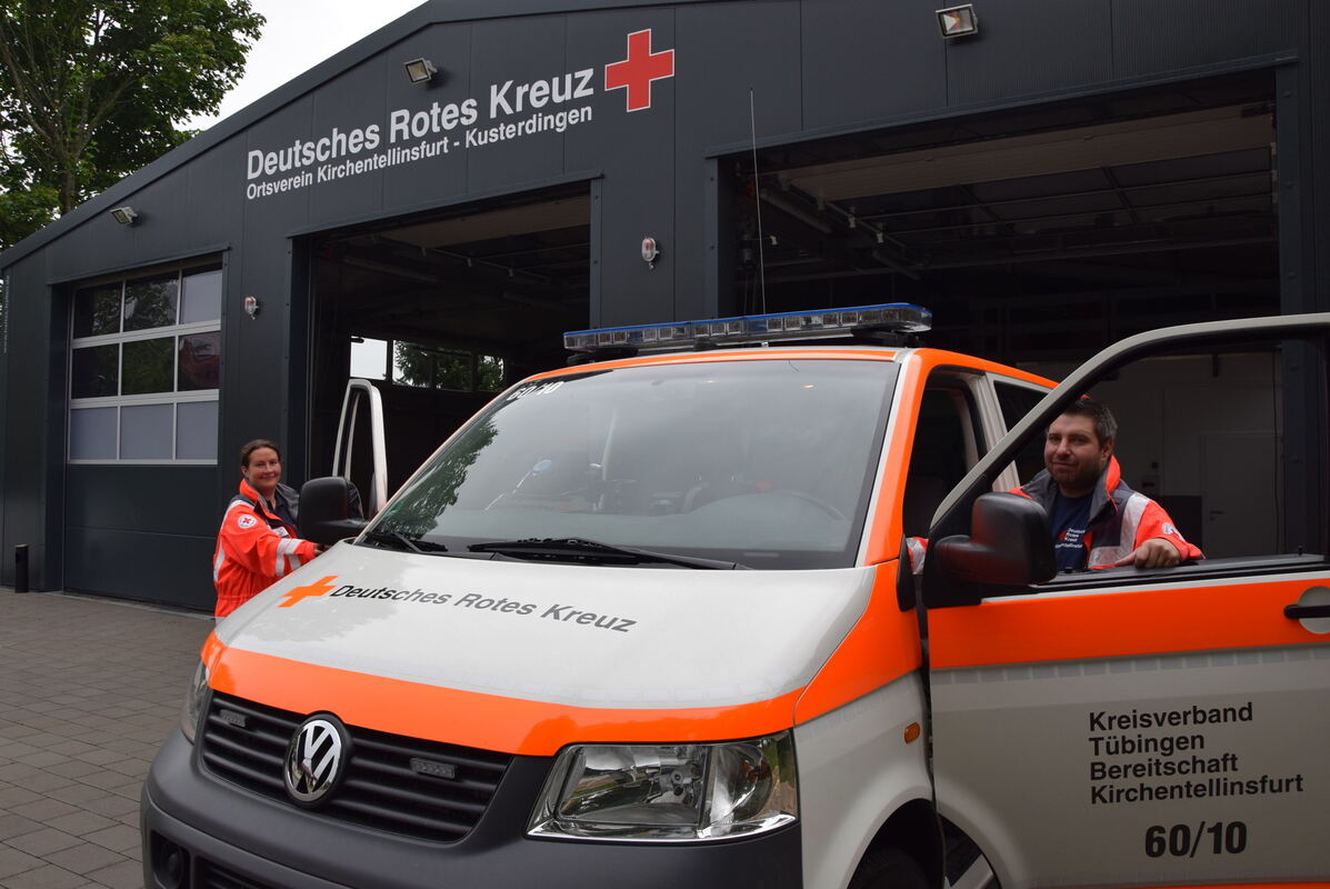 Seit wenigen Tagen geht’s von hier zu den Einsätzen: Tina Kehle (links) und Ted Bürker vor der Halle am Faulbaum. FOTO: -JK