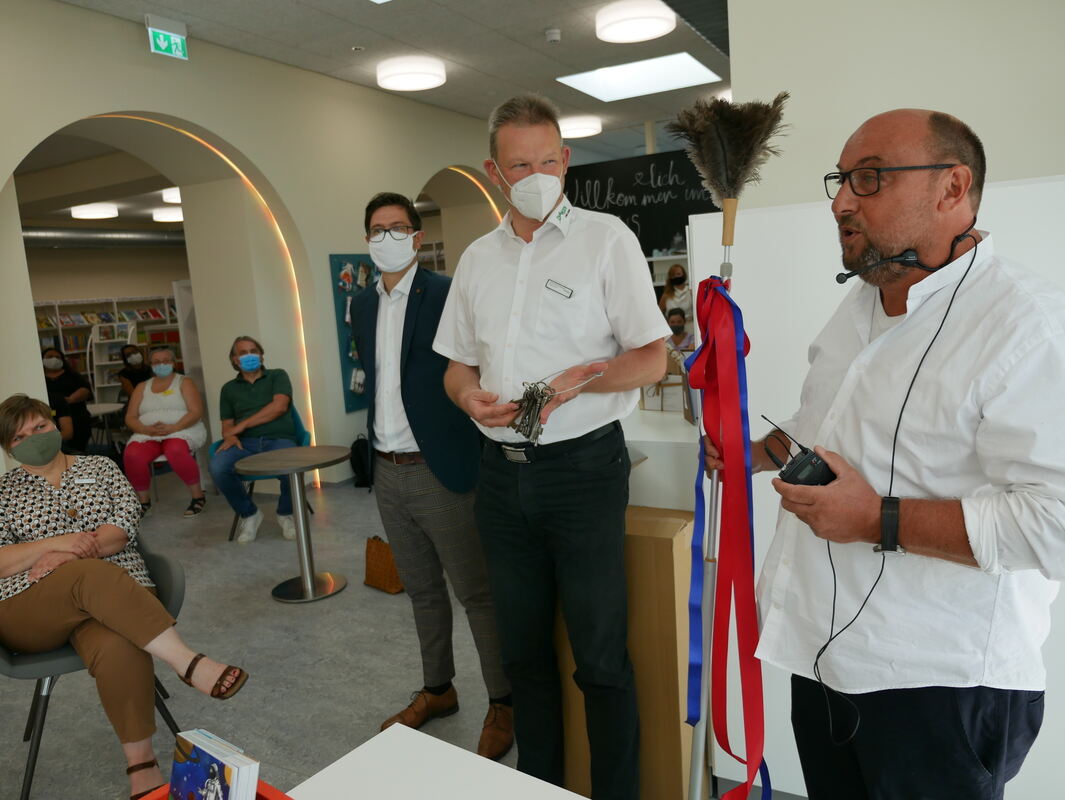 Sowohl die Sanierung des Hauses wie auch die Gestaltung der Außenflächen seien laut Sigmund jedoch wie die Suche nach der »eierlegenden Wollmilchsau« gewesen. Allerdings mit erfolgreichem Ende. Ähnlich formulierte es auch Rainer Klett, jedoch in Versform, ähnlich wie einstmals Schiller es vielleicht ausgedrückt hätte. Als Geschenk für den Bürgermeister hatte Knies einen riesigen Bund voller Schlüssel für das Gebäude mitgebracht. Und einen Staubwedel. Um die Vögel-Mobiles im Treppenhaus abstauben zu können. »Wenn man über mehrere Jahre ein Kind großgezogen hat, dann tut es schon auch weh, wenn man es ziehen lassen muss«, so Knies. (GEA)