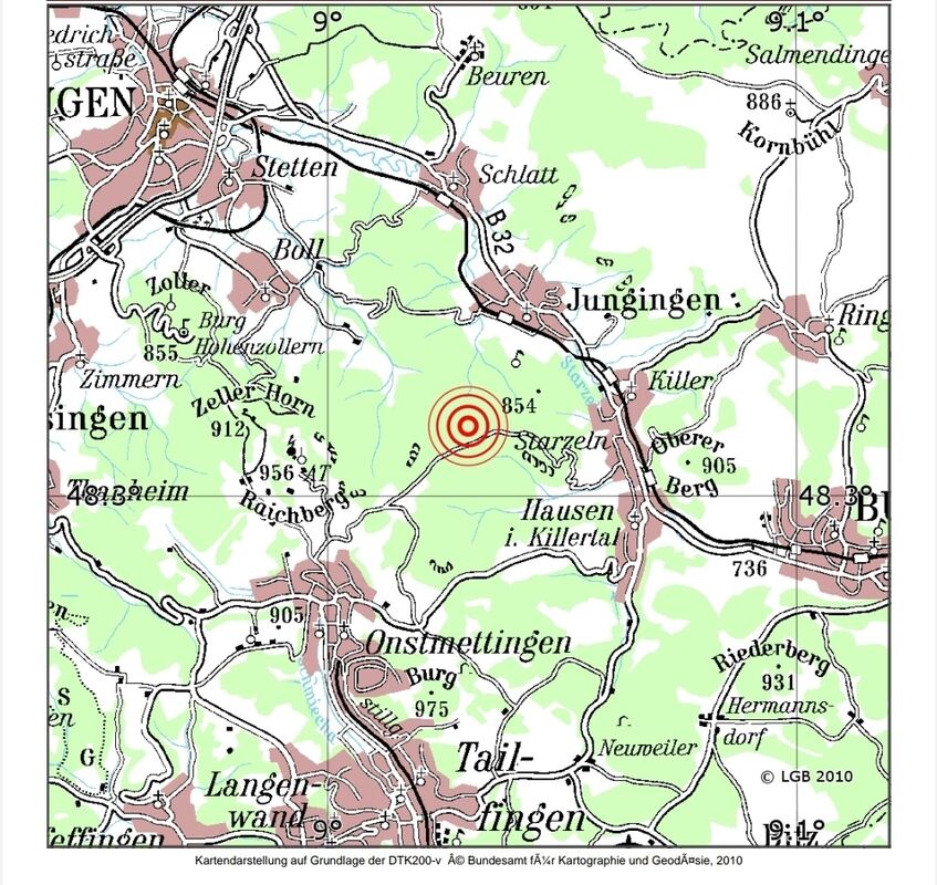 Das Epizentrum des Bebens lag nach Angaben des Landesamts für Geologie und Bergbau zwischen dem Burladinger Teilort Starzeln und dem Albtrauf bei Onstmettingen, östlich des Raichbergs. Der Schweizer Erdbebendienst maß bei dem ersten Beben eine Magnitude von 3,9 und gibt eine Tiefe von 16 Kilometern an.