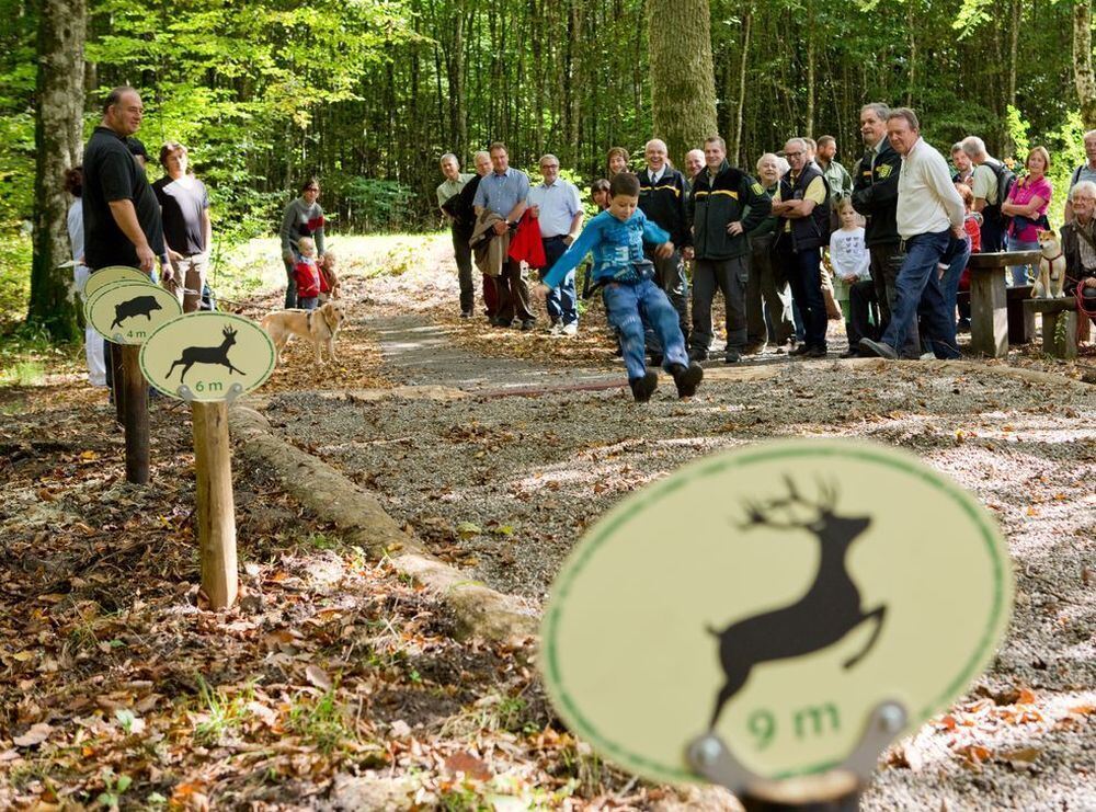 Nicht jeder springt neun Meter wie der Hirsch. Auf dem Rotwilderlebnispfad kann man seine Sprungkraft aber auch mit einem Eber oder einer Maus messen.